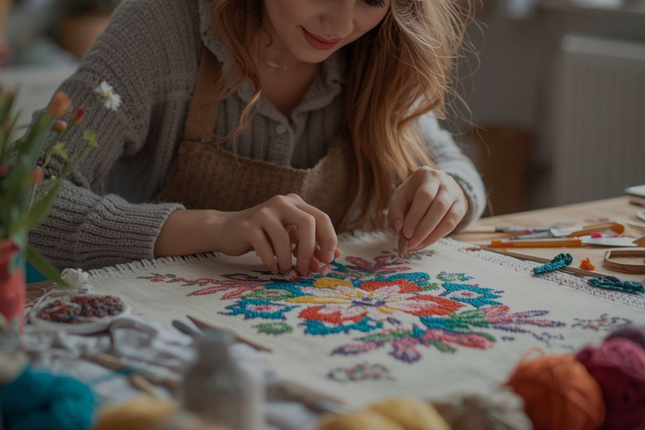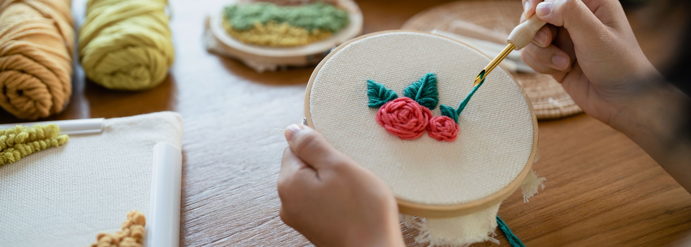 Na začátku si ukážeme, jak správně napnout plátno do rámu a připravit pracovní plochu. Seznámíte se s nástroji i materiály a vysvětlíme si rozdíly mezi jednotlivými typy přízí.