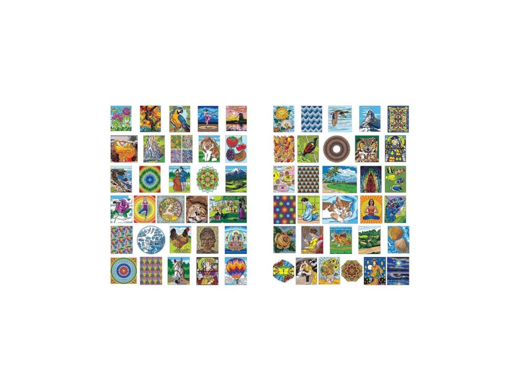 Na zadní straně obálky najdete praktický rozkládací barevný klíč, který můžete pohodlně rozložit vedle stránky, a uvnitř obálky barevné ukázky hotových ilustrací pro inspiraci. Témata zahrnují roztomilá mláďata, slavná umělecká díla, klidné mořské scenérie, propracované mozaiky a mandaly či okouzlující vitrážové vzory.