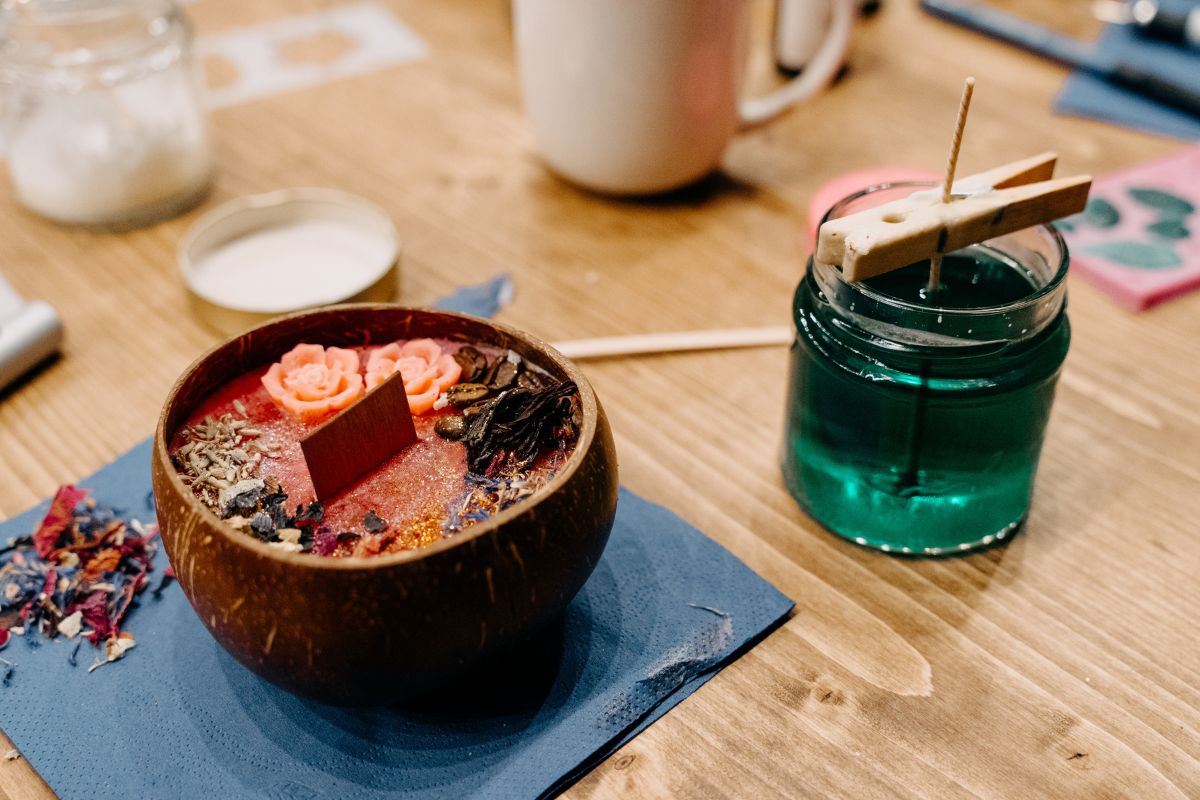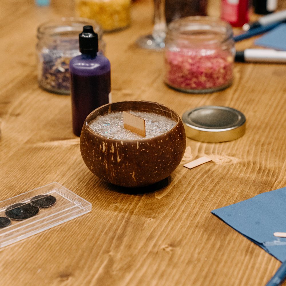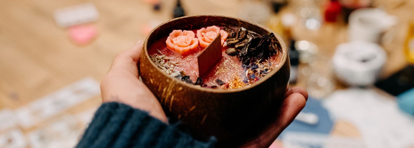 U první svíčky nám jako dóza poslouží pravá kokosová miska, do které si namixujeme libovolné přírodní vosky, organické vůně a barevné pigmenty. Přidáme dřevěný knot a následně svíčku ozdobíme kytičkami a lístky odlitými z vosku nebo pravými sušenými květy a bylinkami.