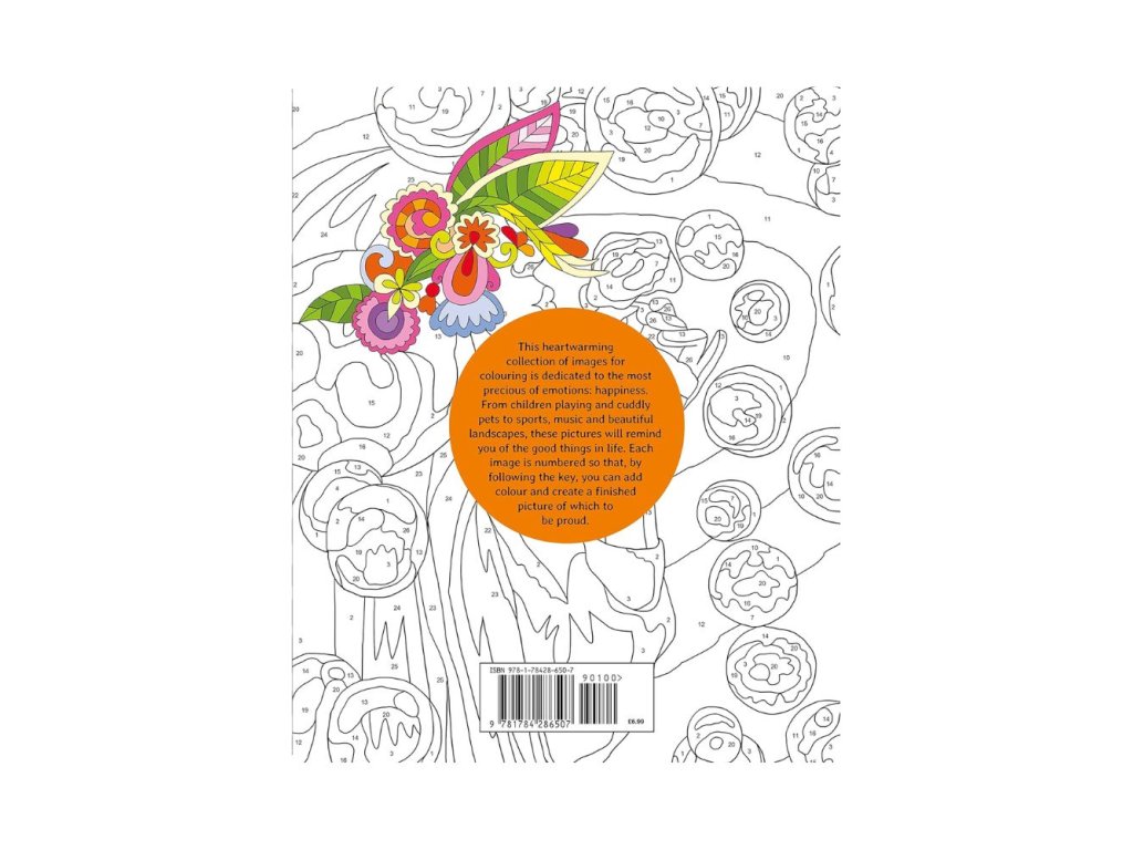 Kniha Happiness Colour by Numbers z oblíbené série Arcturus Colour by Numbers Collection přináší hřejivou sbírku více než 60 předloh k vybarvení podle čísel, věnovaných tomu nejcennějšímu pocitu – štěstí. Najdete zde děti při hře, roztomilá zvířata, sportovní a hudební scény i nádherné krajiny. Každý obrázek je očíslován a propojen s barevným klíčem, který vám umožní snadno vytvořit harmonické a poutavé ilustrace.